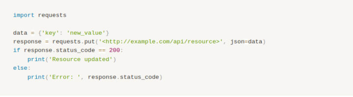 Here's a simple Python example of using the requests library to make a PUT request:
