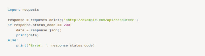 Here's a simple Python example of using the requests library to make a DELETE request: