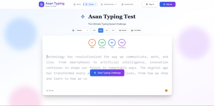AsanTyping is a free online platform designed to help people of all ages improve their typing skills. It offers everything from a quick typing test to step-by-step lessons with its typing tutor, making it perfect for all.