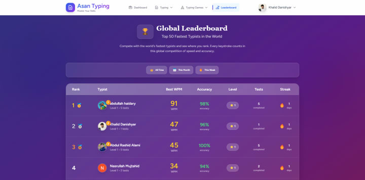 The Leaderboard is another feature that sets AsanTyping.com apart. It shows all users' scores and rankings globally.