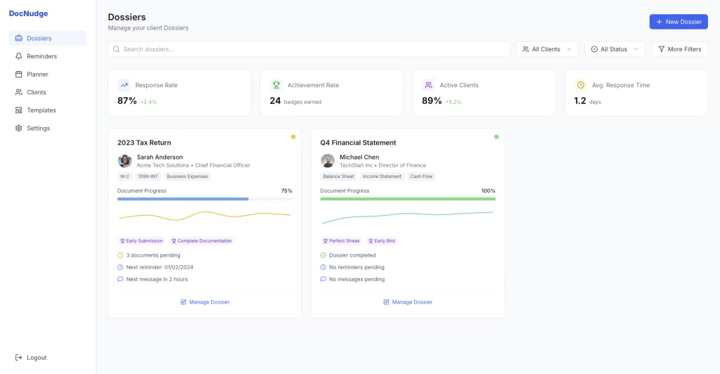 DocNudge - a client engagement platform that helps businesses collect documents and information from their clients more effectively through automated reminders, gamification, and smart document verification.