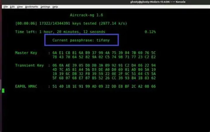 The hacker will show you the encryption type, the SSID, and the password used.