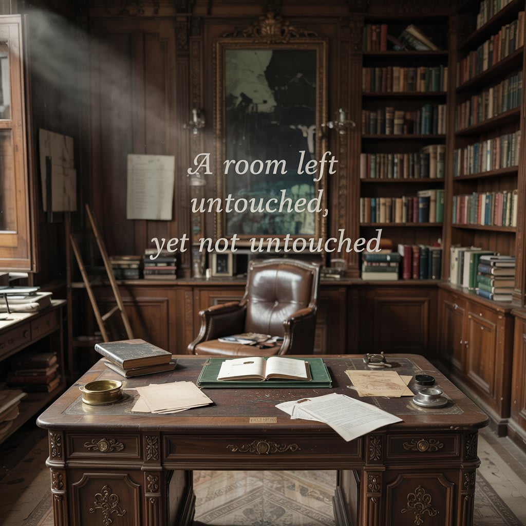 Dust filled my throat the moment I stepped inside. The flashlight beam swept over a room preserved like a museum—no decay, no rot. A grand four-poster bed stood against one wall, its velvet canopy intact. A writing desk by the window held yellowed papers and a fountain pen frozen mid-stroke. There were portraits on the walls—faded faces with eyes that seemed to follow me.