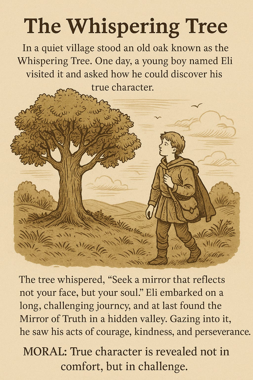 One autumn afternoon, while wandering near the edge of the forest, Eli found himself at the foot of the Whispering Tree. The wind was soft, and the branches danced gently. As he sat beneath the canopy, he whispered, “I wish I were brave. I wish I knew who I really am.”
