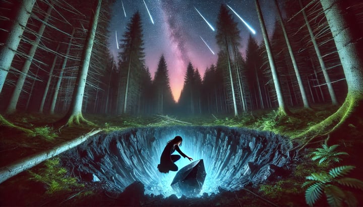Curiosity ignited, she bolted from the roof and drove her rusted pickup into the woods. Guided by the faint glow ahead, she stumbled upon a crater. In its center lay a shimmering, obsidian-like fragment pulsating faintly, as though it were alive. When Mira touched it, the world around her shifted.