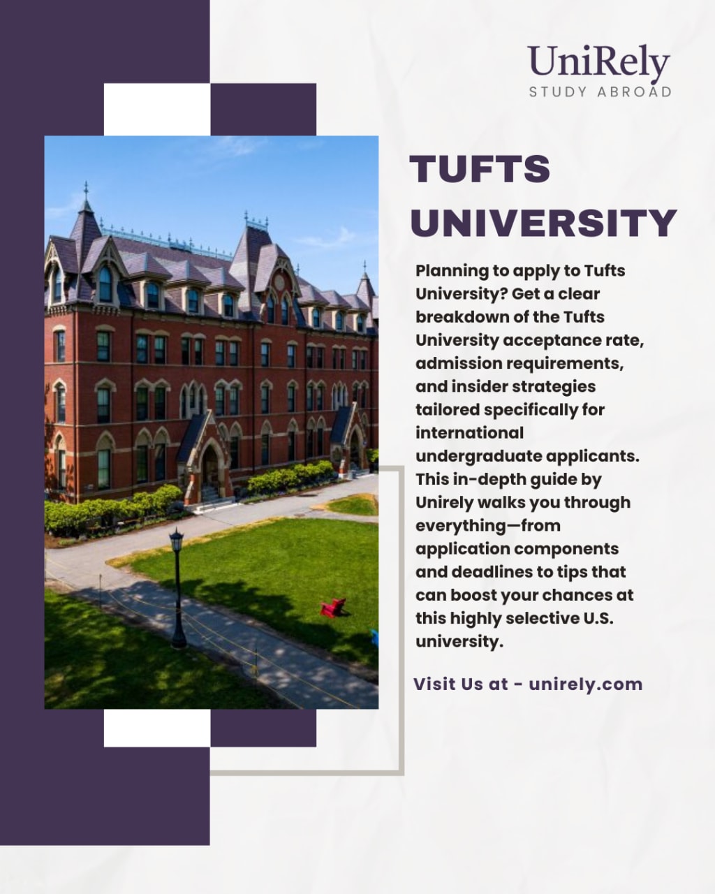 Planning to apply to Tufts University? Get a clear breakdown of the Tufts University acceptance rate, admission requirements, and insider strategies tailored specifically for international undergraduate applicants. This in-depth guide by Unirely walks you through everything—from application components and deadlines to tips that can boost your chances at this highly selective U.S. university.