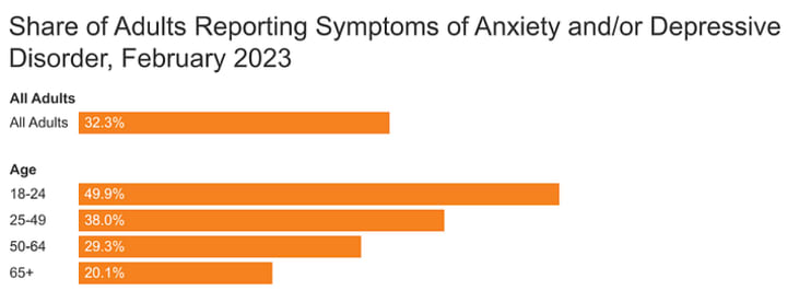 In February 2021, approximately 39.3% of adults experienced symptoms of anxiety or depression, which decreased to 32.3% in 2023.