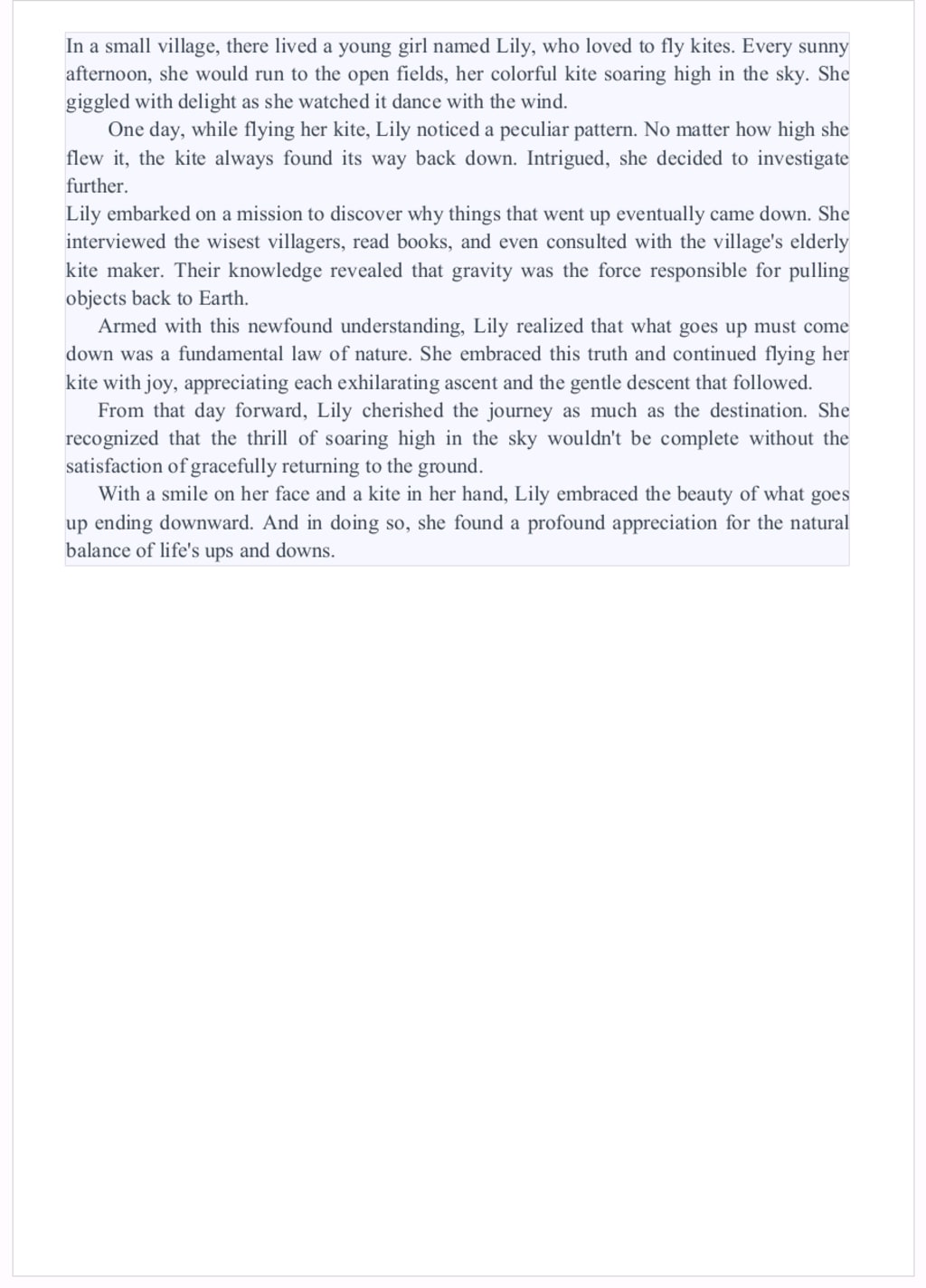 And so, the village thrived, guided by the understanding that balance and acceptance were the keys to a fulfilling existence. Ethan's quest had taught them that the magic of life lay not in the destination but in the journey itself, where every ascent held the promise of a graceful descent.