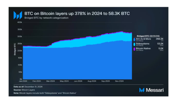 In the final quarter of 2024, around 268,300 BTC was transferred to Layer 1 and Layer 2 networks such as Ethereum, Solana, and Arbitrum, while an additional 53,200 BTC moved to Bitcoin side systems like Stacks, Merlin, and Core. Although BTC bridging to L1s and L2s remained the dominant trend, BTC migration to side systems witnessed a 378% surge in 2024, indicating a growing inclination toward leveraging Bitcoin within native environments.