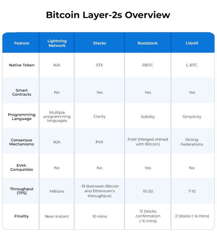 The chart below highlights key differences among major Bitcoin Layer-2 solutions, illustrating their distinct roles in unlocking BTC’s full potential for DeFi, staking, and enhanced liquidity.