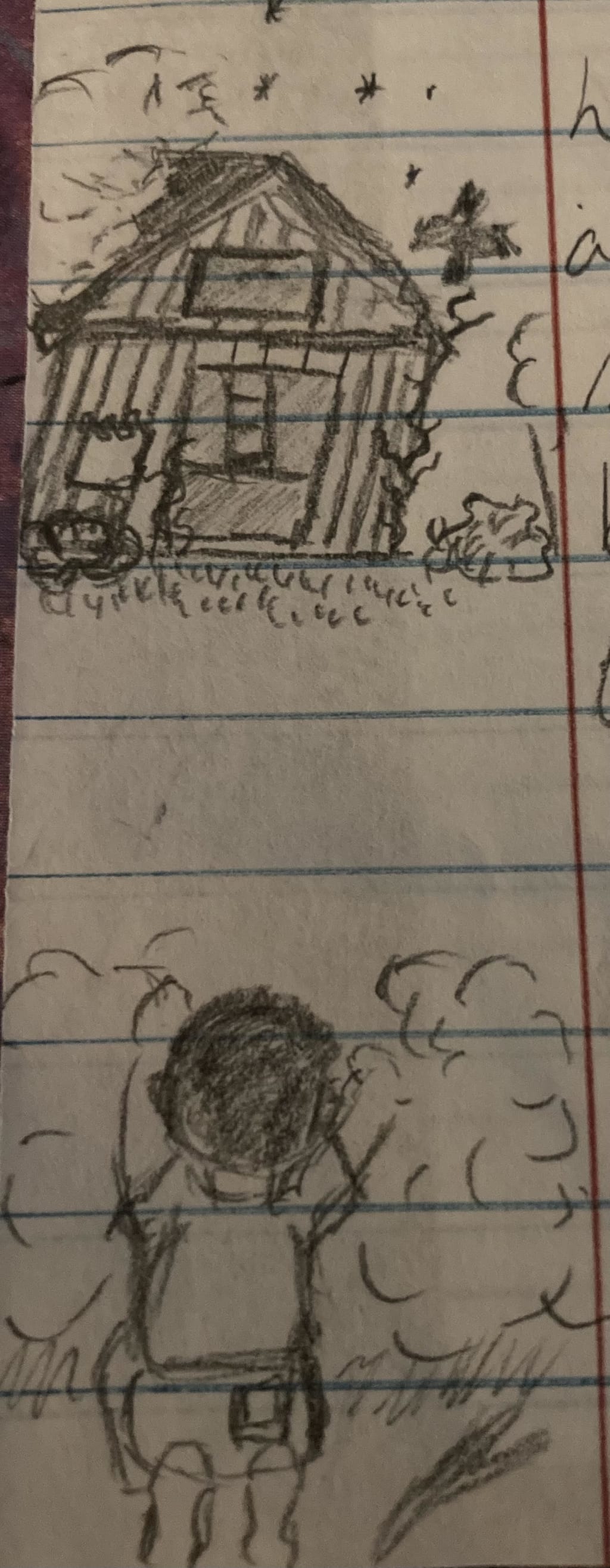 Sprinting through the brush he could see what looked like a bird and an ear-piercing shriek echoed in the silent night air. "I've not heard such a sound before," leaning against a tree he peered through the tangled limbs,"doesn't sound like any bird I know of." Watching the figure land on a branch, he wondered if he should continue. The figure spread out it's wings and flew off towards the boys' home. His adrenaline flowing through his body, he sprang out from behind the tree. He must pursue.