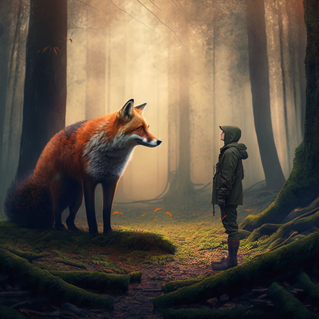 Finn made his way through the forest until he found the hunters' camp. He walked up to the hunters and spoke to them in their own language. The hunters were shocked to hear a fox speaking to them, but they listened as Finn explained that the animals in the forest were not to be hunted. Finn spoke with such conviction and passion that the hunters were moved by his words.