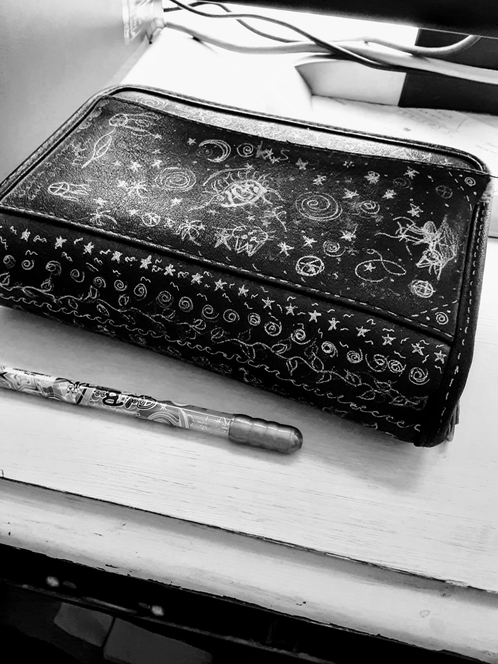 Jaime pulled the black notebook out and saw the doodles she had made on it with her gel pens when she was in 5th grade. The pink and blue metallic stars and palm trees, cats and peace signs were faded with age but still quite beautiful against the soft black leather. Jaime remembered the big antique oak desk where her mother had kept this notebook so many years ago. It had a pocket in the front, Jaime ran her hand inside and sadly found it empty. It opened with a zipper and as Jaime sat down to look inside her mother quickly grabbed it from her.