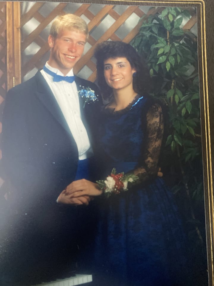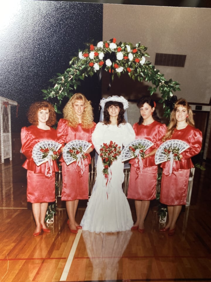 One of the more impressive projects under my mom’s belt is her poofy-sleeved 80’s wedding dress. She also made the dresses for her bridesmaids. Her hand-made dresses for her high school dances eventually made their way to my dress-up box. My favorite was the tea length dress with black lace long sleeves and a silky royal blue layer under the core of the dress, everything trimmed with blue sequins. No doubt this dress was a part of an ensemble of fluffy hair and blue eyeshadow. (On a side note, I wrote this last sentence before I found this picture below. Who would've thought I was right!?) I also loved the one she made that was reminiscent of Sleeping Beauty’s pink dress. All these dresses were far too big for me when I was most interested in them, but that didn’t matter much