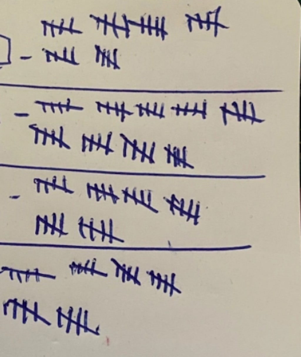 I flipped to the first page and there were only lines there. Hash marks. The kind of marks you make to tally things or to keep score. Each grouping had the traditional four vertical lines and the diagonal slash to mark groups of five. And there was page after page of them. What could he possibly have been keeping track of? The days he had been alone since Mom had passed? The pigeons that landed on his windowsill? Games of solitaire he had played at the kitchen table?