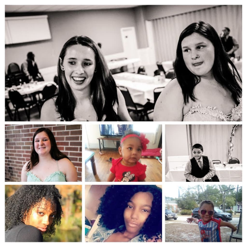 The Children in the top photo are my niece that taught me how to be a mother I have been with them since they were born and have helped every step of the way..... The child in the suite and the two girls at the bottom are my bonus children and I love them with all my heart and have watched them grow and have been in their lives for the past 7 years. Then there is the little girl in the center and the last little boy I birthed them both and they have brought me so much joy to be a mother... I was not suppose to have any children of my own as I was told by the doctors and in February of 2015 I had Joseph he was 5 weeks early and was so so small he was only 3lbs and 9oz but was a fighter from the start. He had an IV in his head to do platelet transfusions the day he was born, then at a month and a half old he had surgery for two testicular hernias' and had those fixed, then at the age of 2 he was going in for another surgery to have his tonsils and adenoids taking out so he would be able to breather and get a better nights sleep and come off the bottle. Now he is 80lbs and 4ft tall and a healthy happy 5 year old boy. He was my rainbow baby. He looks like me and acts like his daddy. Then in October 2018 I became a mother to a beautiful baby girl Lena and she filled our house with more joy and love. She is a sassy little 2 year old now. She looks like her father and acts like me sometimes. My niece's Ashlyn 17 years old and has turned into an amazing young lady and has her mind set about what she wants out of life and Justiene 15 years old is starting to become a amazing young lady she is just not sure which way to take yet but in due time it will come to her. I thank them every day for helping me get ready to be a great mother to my own children. They also help me with their cousins when needed that are amazing I also thank god that he gave me three bonus children Briana 20 years, Brittany who would of been 18 years old this year and Michael 11 years old now. They are amazing with their little brother and sister. Briana has had her ups and downs as do all children but she has turned into a loving caring and all together amazing young woman and has her life all planed out. Unfortunately my husband and I lost Brittany in April 2019 at the age of 16 to a car accident, and it has been hard for us and all of our children to coop with but with the strength of GOD and the support of one another we have been living day to day hour by hour, and know that life is priceless and live it to the fullest. Always Always say I love you every chance you get cause you do not know when it will be the last time you get to say it. Michael is special in so many ways he wants guidance but then shy's away from it, he is silly and can be a soon to be teen boy and hopefully he finds his what he is meant to be. He gets mad easily and loves gaming. I believe that is what he is going to be doing when he gets older. I love all my children and would give them the world and then if I had the means too. They are gems and they learn from us what we do they see what we say they end up saying one day we have to mold the minds of our Children and make sure they believe in themselves.