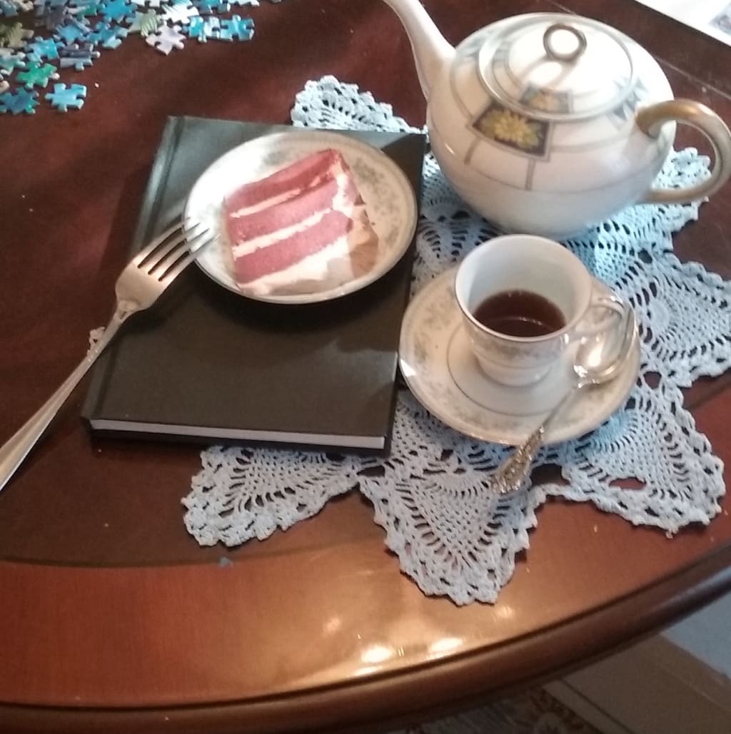 I was feeling such peace as I stopped by her house on my way home from the funeral to be sure appliances were unplugged and lights were off. I did not realize that I had left on the light in the spare room and someone had left flowers on the bed. I glanced over at the box marked personal and I had circled where I had written the words “black book”. I opened the box and carefully unwrapped the plastic from the book she had said for me to open only after her death. I began to read the story of her life and how she loved her home, her husband and her family. I read how she tried new things and explored her talents and created new recipes, like her red velvet cake. She wrote how she wanted someone to love her home after she was gone and hoped that someone special would take care of it and make memories of their own there, as she did. Then I saw my name. My aunt was proud of me and the woman I had become. I was reading her letter to me telling how she desired that I would have her home. She then wrote that if I pulled out the desk, behind it I would find a note for the bank. I struggled to pull out from the wall the heavy mahogany desk. There taped to the back was a sealed white envelope that upon openining I found that she had added my name to her bank account and in it would be 20 thousand dollars to spend any way I desired. I laughed as I read further that she was so happy that I had mastered her red velvet cake recipe and that I was the only one in the family who could make it correctly. I slowly walked down the hallway in tears, into my kitchen. I placed the notebook on the table, sat down and sliced a piece of cake.