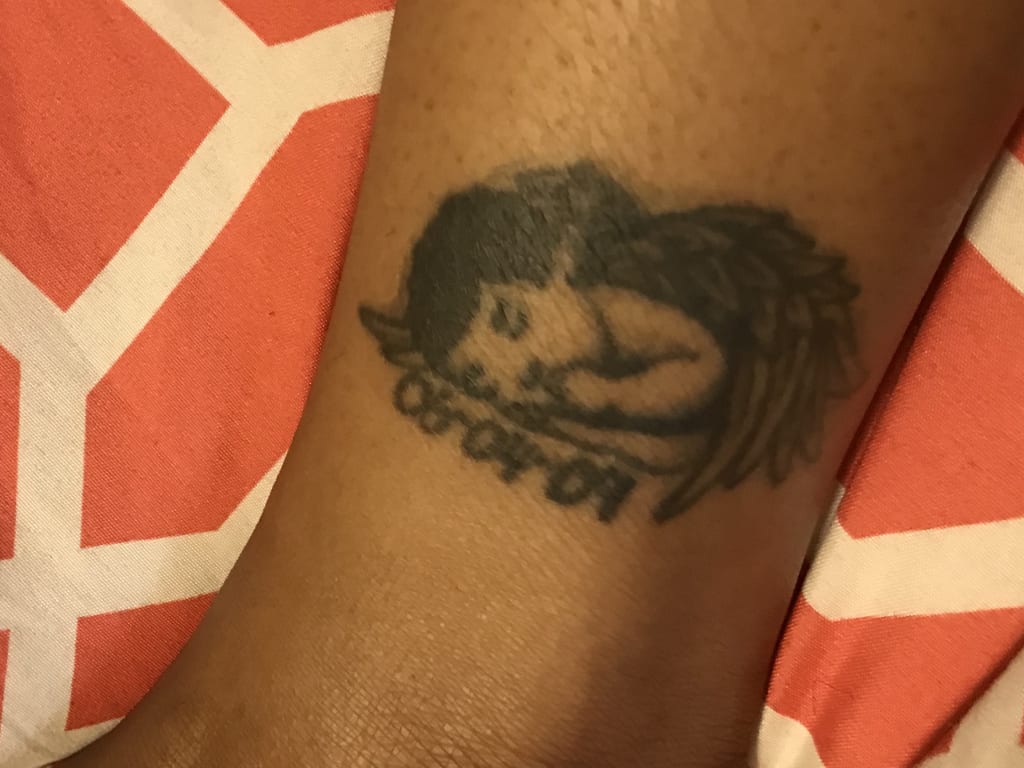 I decided that I wanted a tattoo to honor Taj, my baby boy. I didn't know what to get and I felt like I wanted someone with some connection to me to do it. I went to my ex's cousin and we talked for a while and he started drawing while I spoke. This beautiful representation of my little angel was the result. Although technically he became an angel on June 3, I was able to meet him and love on him, and release him on June 4. I felt like that was when he truly got his wings and I wanted to always remember him in that way. Even now when I’m dealing with difficult situations I look at my tattoo and remember the hardest thing I ever had to deal with and I remember that I got through it.