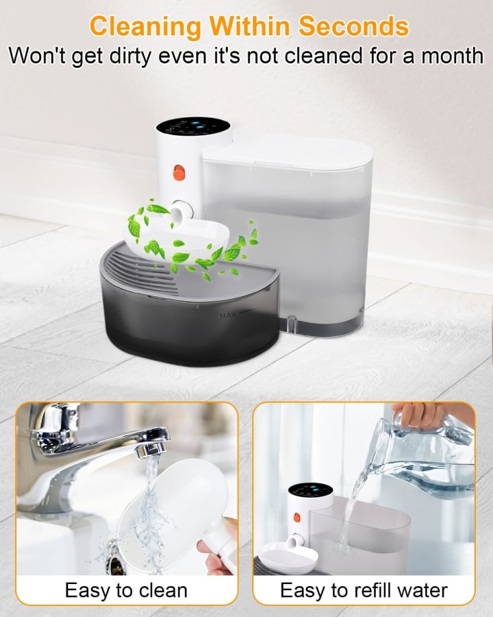 But beware: When the water gets low, the pump makes a distressing gurgling sound, as if it’s gasping for life. This is your cue to refill it before your pet starts giving you judgmental looks.
