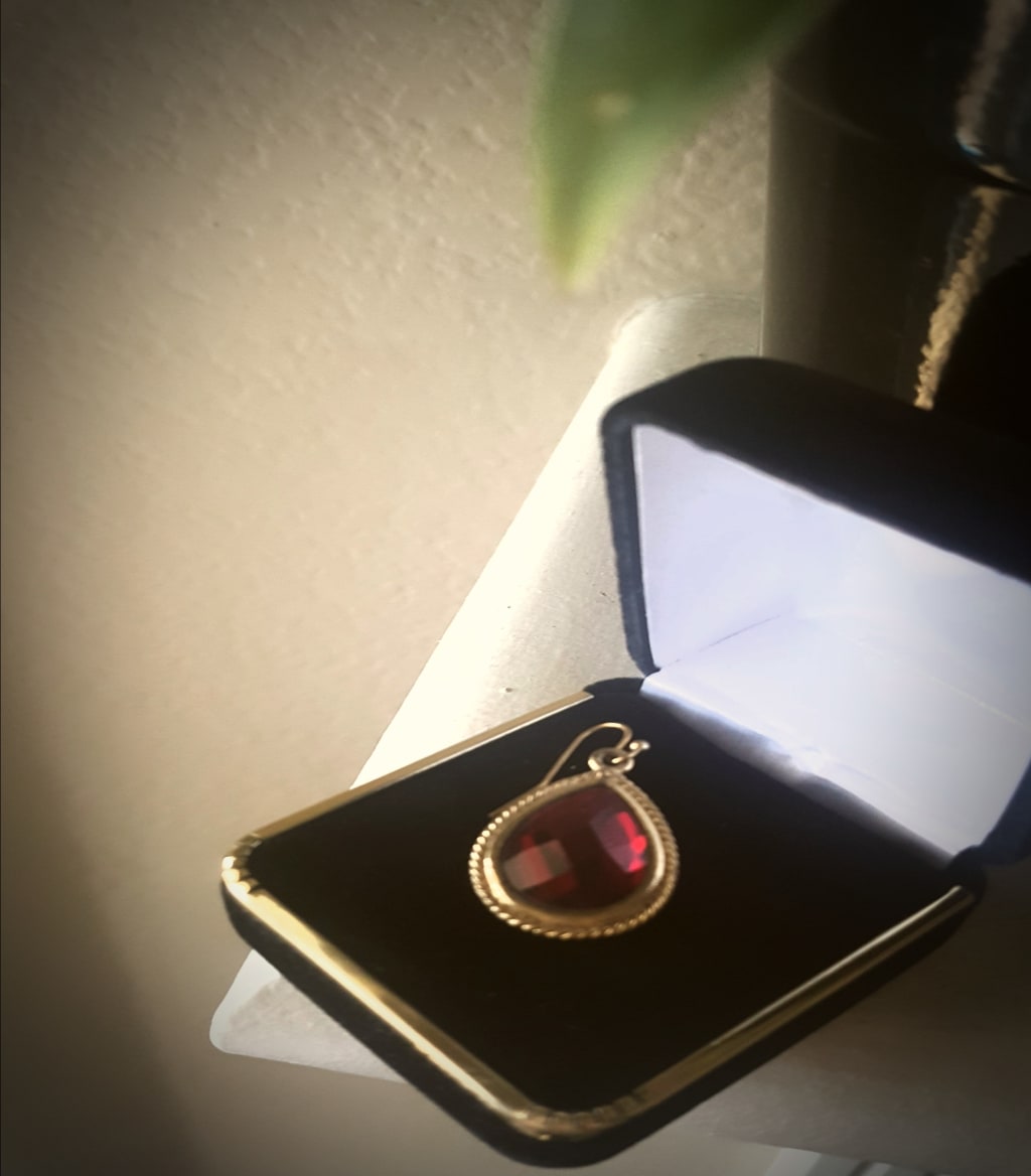 I opened the box and angled its contents so that we could admire it together. Tiny prism cuts reflected light across the ruby earrings pinned to the velvet cushion. Mesmerizing to gaze at; the colors varied from fire to blood. Burnished gold framed the edges in a delicate teardrop suspended by a curved hook begging to pierce a delicate piece of skin.