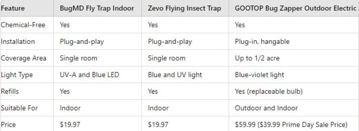 Each of these products offers unique benefits tailored to different needs. For indoor use, both the BugMD Fly Trap and Zevo Flying Insect Trap provide excellent, chemical-free options at an affordable price. If you require extensive outdoor coverage, the GOOTOP Bug Zapper Outdoor Electric is a standout choice, especially with its Prime Day discount.