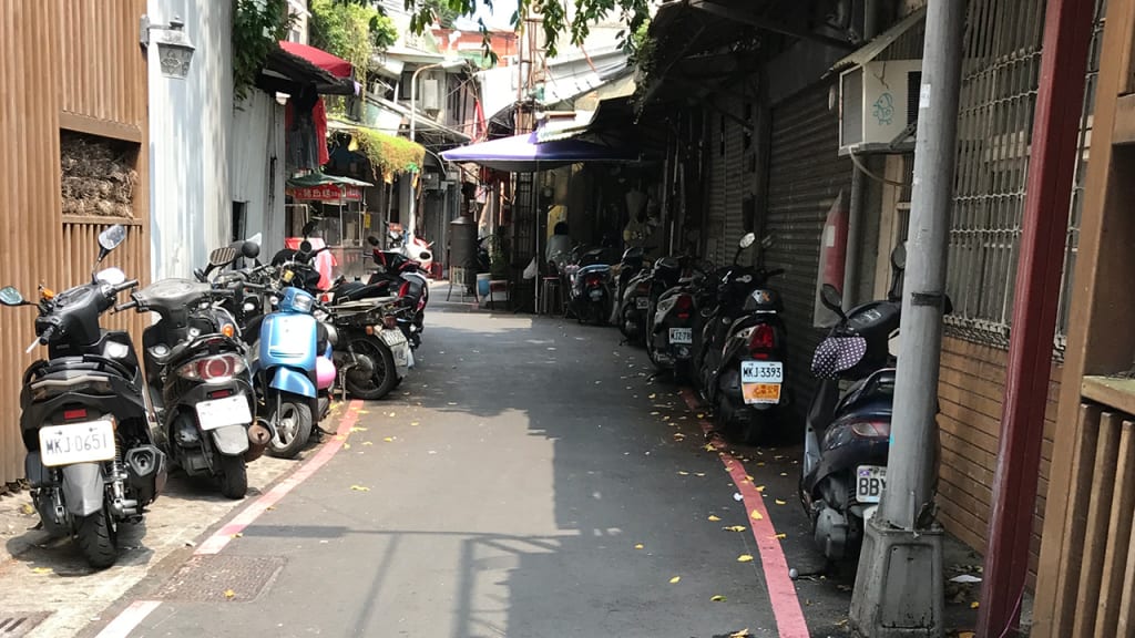 It's a small nook between two houses on a backstreet, surrounded by mossy stone walls cracked with age. Inside an overgrown garden around a small ramshackle shrine, incense candles long burned out, the only offerings are from a seventy year old grandfather in the house on the left. Under the eves lies a small shabby and wild dog, fast asleep as the rainy day plays on, its music, the pattering against the tiles and pooling in old pots.