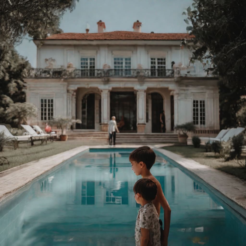 Behind him, the pool shimmered azure blue, its surface placid. Henry remembered summers past when this water had been alive with laughter and activity. Now, its stillness seemed to match the quiet that had fallen over the once lively house.