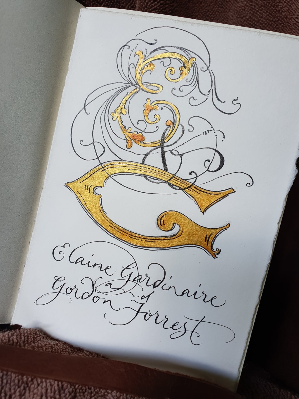 I put the photo aside and sat stunned looking at the first page that bore the fancy hand painted letters. E&G in luminous gold and black ink. Underneath, Elaine Gardinaire and Gordon Forrest. Madame Gardinaire and my Dad! You’ve gotta be kidding.