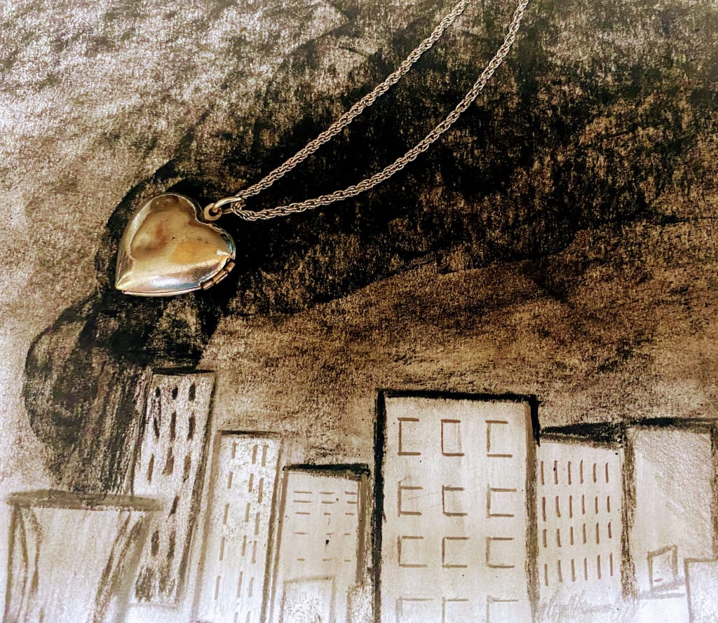 The door to the house swings open to reveal an indiscriminate being covered head to toe with an amalgamated fashion of fabric. Faith launches forward to the intruder, and the pendant swings free on the necklace laced about her neck. The form of a man opens its arms invitingly, and Faith grabs upon every piece of fabric she can manage as if it is a rope above an endless abyss.