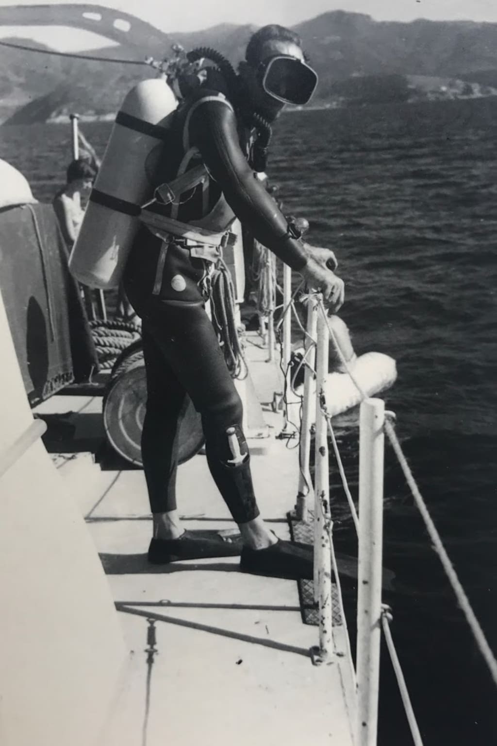 The three girls at the rail watched as we climbed onto the dive platform and I sat there while the shaking slowly subsided. They stared at me with worried expressions. This reaction was new to them. "My God, Bill," Dianne said at last. "What on earth happened ?"