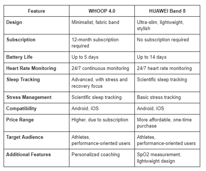 In short, WHOOP 4.0 is the better choice for those who focus on improving performance and getting detailed health insights, while the HUAWEI Band 8 offers a more stylish and affordable option for daily health tracking. Your choice should align with your fitness goals, budget, and personal preferences.