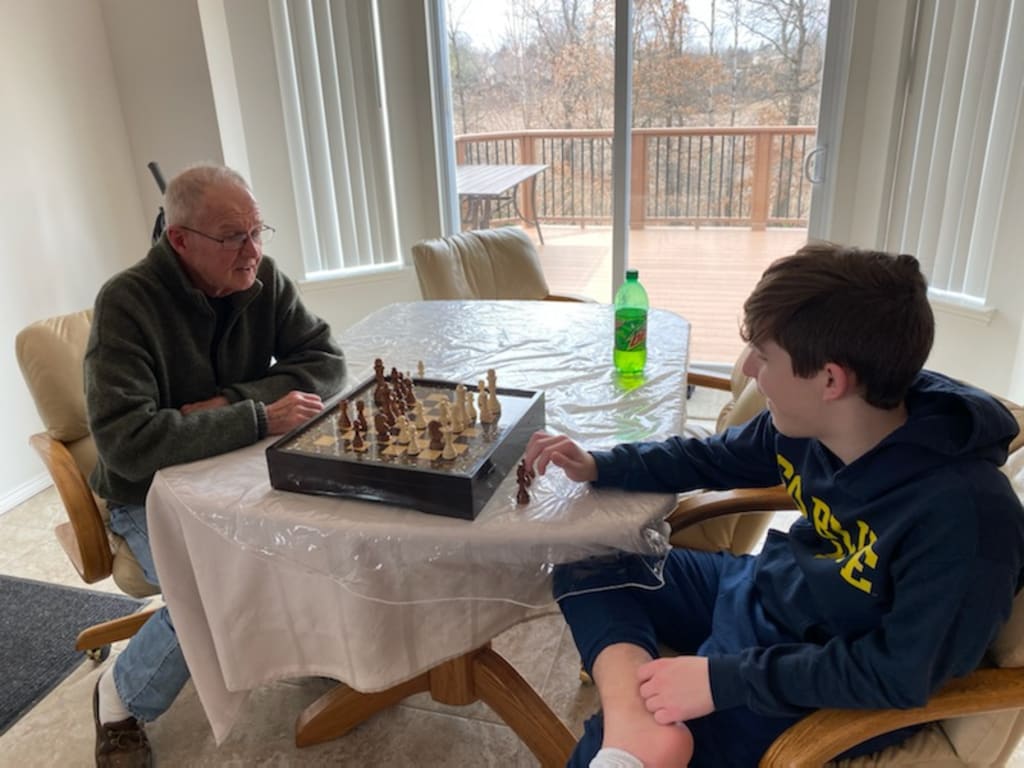 My siblings and I are very close in age, my sister is eight months older than me, my brother a year and a week younger. I like to think that we were pretty good kids, but even pretty good kids are a handful when you’re outnumbered, so our parents didn’t go out often. When they did get a chance to sneak away, they took us to our grandparents’ house for the night. There were three things we could always count on when we went to our grandparents’ house. First, their dogs, Abbey and Rose, would lick us until we couldn’t breathe if we got down on their level. Second, grandma would make us oatmeal before bed. Third, papa would be reading, playing chess, or watching baseball.