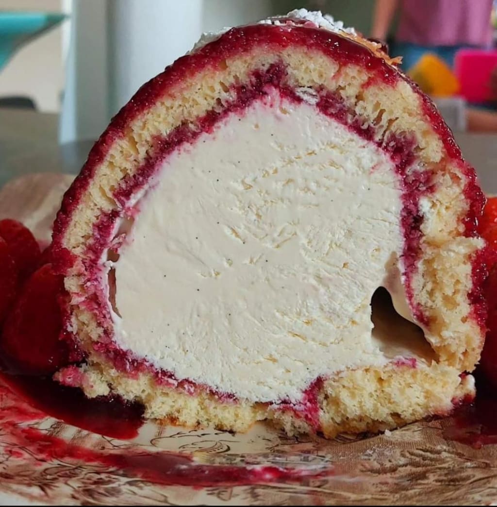 How wonderful that today I could write a recipe that whips all of the above into cream, freezes it until soft, rolls it, and wraps it in a light, fluffy sponge before drizzling it affectionately, some may say seductively, with licks of raspberry coulis.