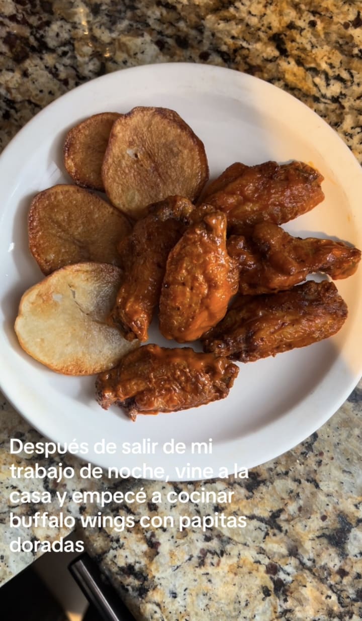 Below is a photo of my buffalo chicken wings with potatoes that are round shaped! The Spanish caption translates to: After coming home from my night shift job, I began to cook Buffalo Wild Wings with round shaped potatoes.