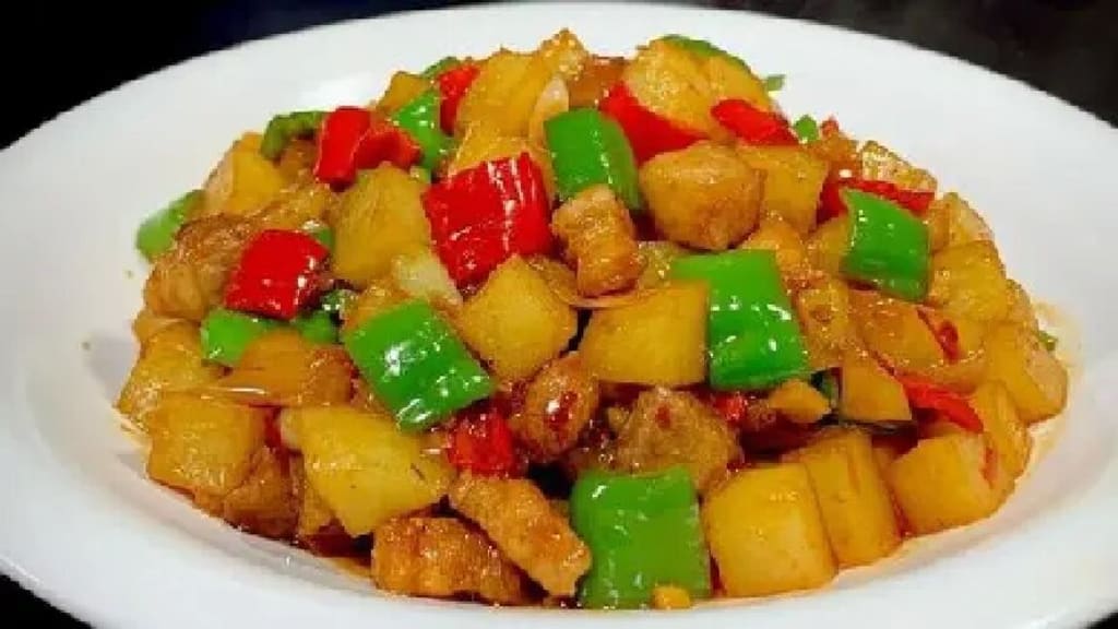 7. Add potato slices, green and red pepper rings, salt, sugar, light soy sauce, oyster sauce and leek.