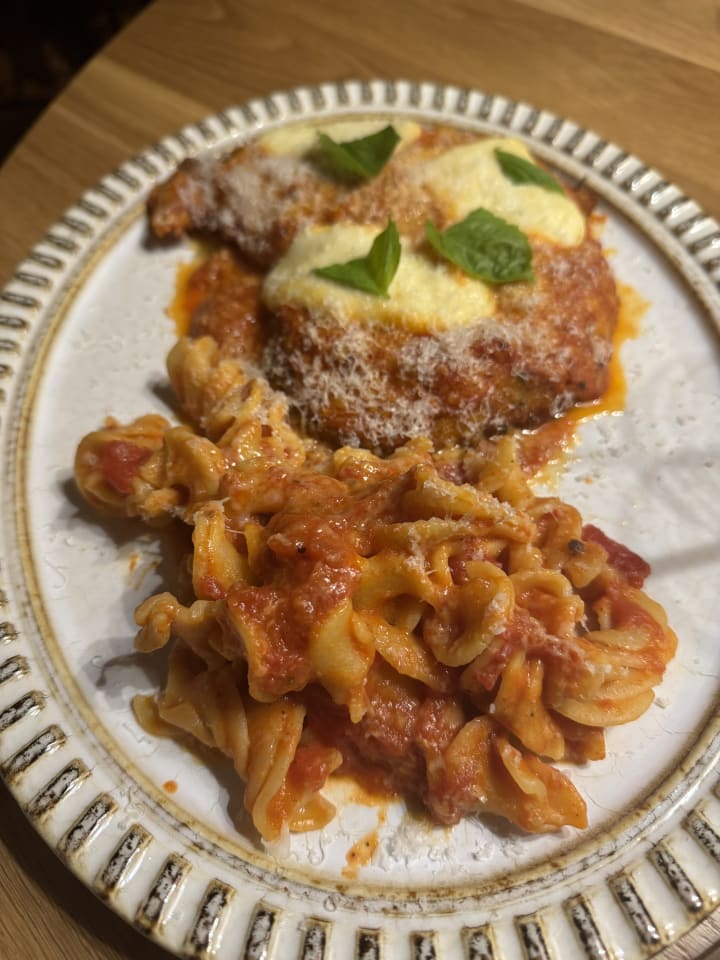 We put on our order for our main dishes. Everything on the menu sounded so absolutely fantastic. I ordered the vodka sauce fuccelli. my wife ordered the chicken Parmesan. My other guest ordered the a brace pork shoulder with saffron rice. We also ordered a chicken Milanese dish and lastly linguine clam sauce. we also ordered for the table a bread that consisted of truffle cream, prosciutto, and Stracietella.