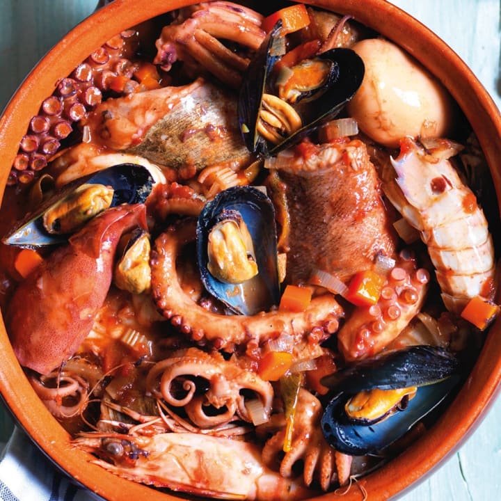 Cacciucco is a popular Tuscan fish stew. It is a combination of five different types of seafood. Octopus, squid or cuttlefish are put into the stew first, and then tender-fleshed fish, mussels, and prawns are added toward the end of cooking.