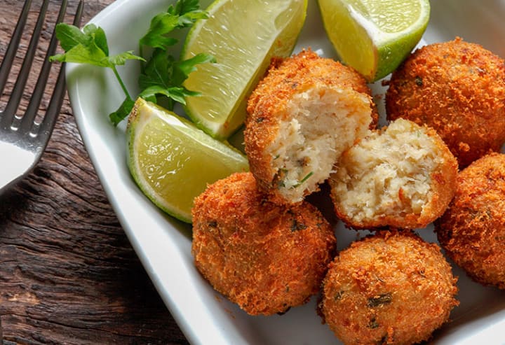 Croquetas de bacalao is a dish that is prepared with salt cod and bechamel sauce. The salted cod is cooked and flaked shaped into croquettes, and coated in breadcrumbs and fried golden brown.
