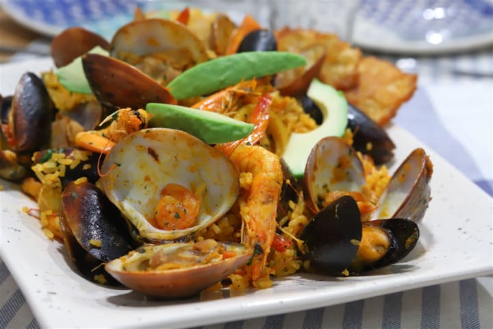 Arroz marinero is a traditional seafood and rice dish. It is made with sauteed vegetables like onions, peppers, tomatoes, and garlic then simmered in stock or water with spices. Different seafood and shellfish is added to the dish.