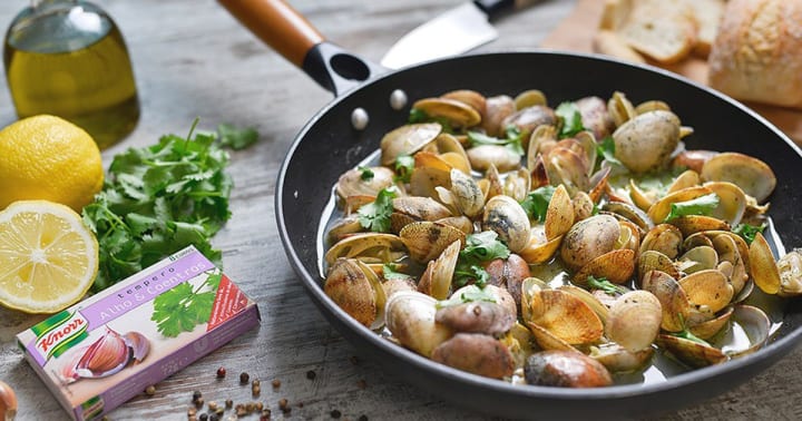 Amêijoas à Bulhão Pato is a dish prepared with clams in a flavorful sauce with olive oil, garlic, lemon juice, white wine, and fresh cilantro. The clams are served as an appetizer with bread on the side.