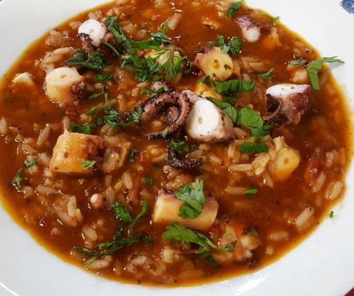 Arroz de polvo is a dish prepared with cooked diced octopus and rice with a flavorable base of tomatoes, sauteed onions, garlic, and spices.