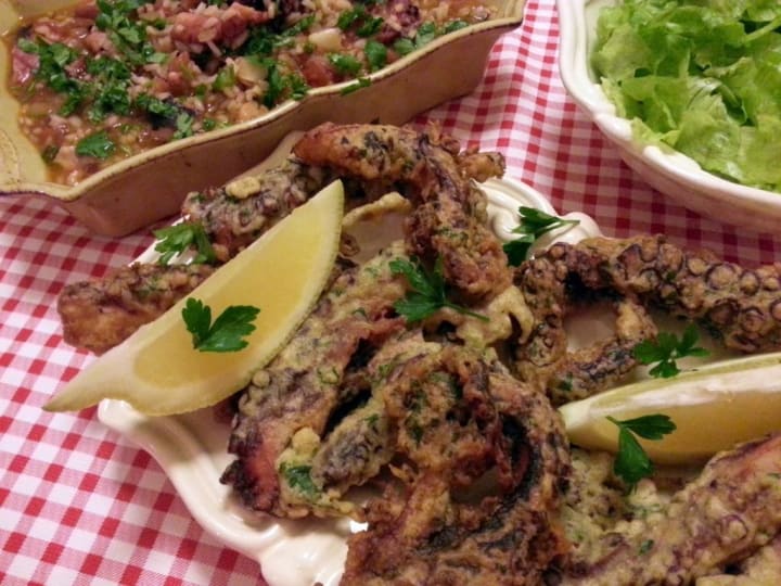 Filetes de polvo is a traditional Portuguese dish. It is prepared with fried octopus tentacles. The octopus is boiled until tender, and seasoned with lemon juice and pepper. The tentacles are dipped in eggs, and dredged in breadcrumbs and then fried in oil until golden brown.