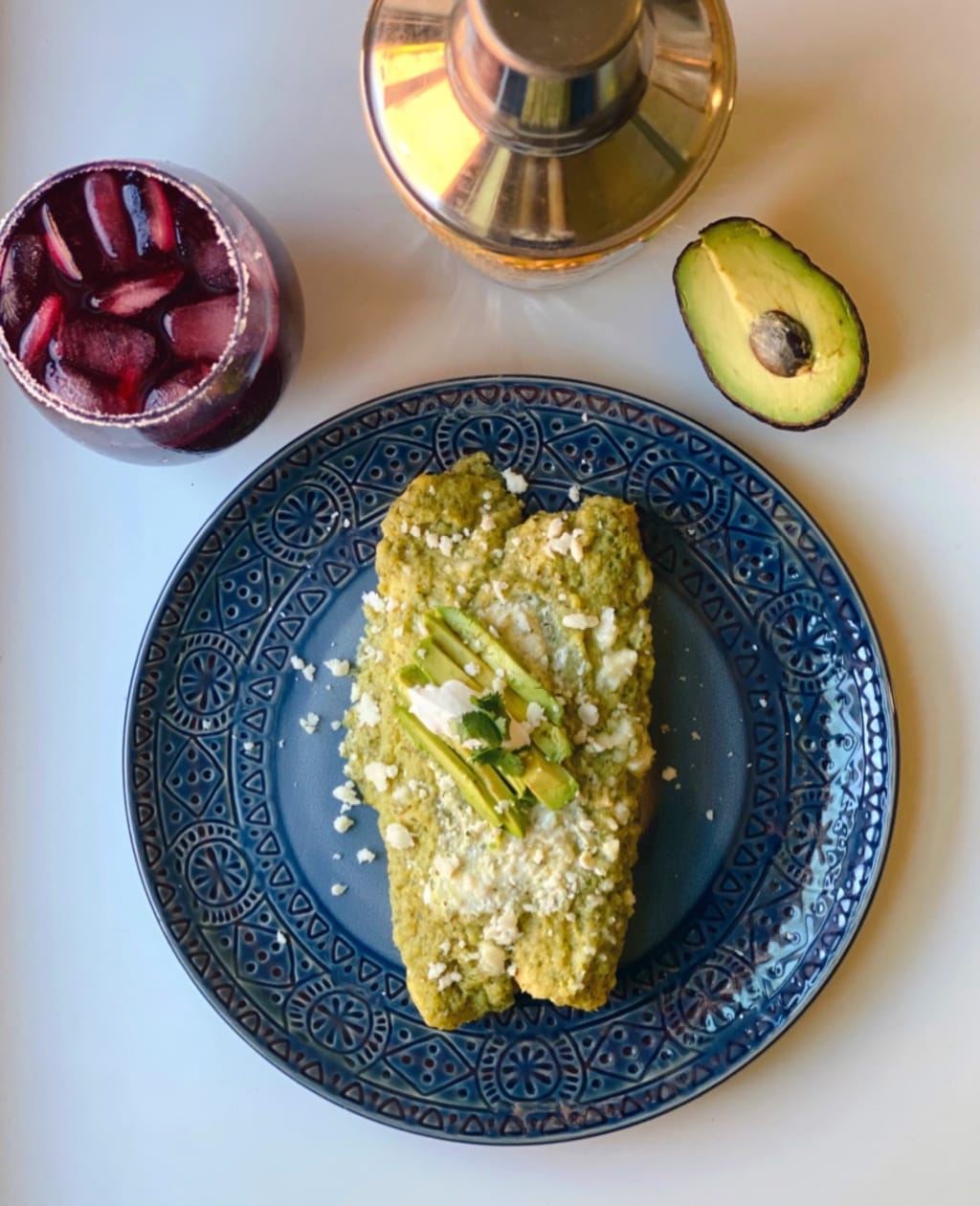 Growing up in a Mexican household in a small border town in South Texas, I had access to the best homecooked Mexican food 24/7! However, when moved away to Boston for college I realized I missed good homecooked Mexican food. I tried a variety of places, but nothing tasted just right. As a result, I started playing around with food. That’s when I really found my passion. Cooking was a way to bring my loved ones together. Hosting soon became a weekly event. I loved every minute of it. It was a way to expose my friends to Mexican cuisine. One of my favorite dishes to make was green enchiladas at home. I couldn’t not seem to find them when I just moved here. However, thanks to Whole Foods I was able to find green tomatillos so, I soon started experimenting. After many many experiments, I concocted a, fast, fresh green enchiladas recipe that tasted just like home. These enchiladas have so much flavor and are really filling. These are vegetarian and gluten free so all my friends could enjoy them! I cook them at least once a week. They never get old trust me. This recipe can be easily modified. If you love spicy add a another pepper, or swap you jalapeños for serrano’s. If you can’t find green tomatillos you can use red tomatoes. Additionally, this salsa base can be used on other recipes. For example, chips and salsa, as a salsa on tacos, or on fried eggs for breakfast. Enough about the enchiladas. No good meal is complete without a proper cocktail! So I decided to pair this dish with a hibiscus margarita. Sweetened hibiscus water was always a staple at my house so why not kick it up a notch with a bit of tequila! Hope you enjoy!