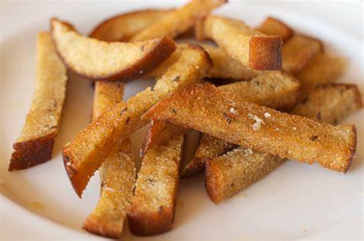 Kepta duona is a simple snack that is prepared with slices of rye bread fried until crispy. The bread is sliced into thin strips and rubbed with garlic before frying.
