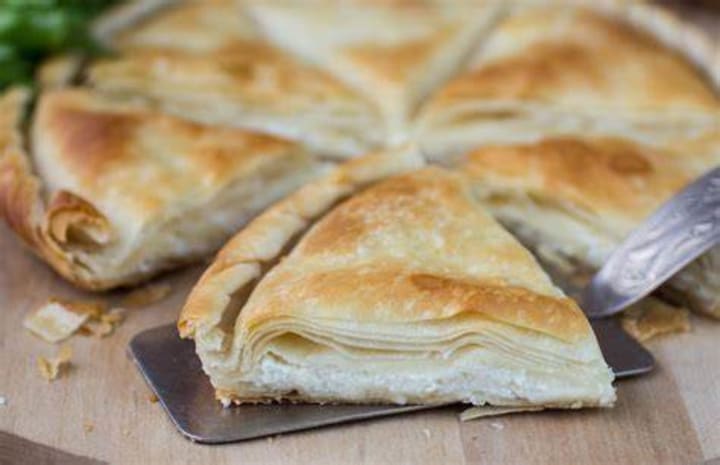 Tiropita is a popular Greek snack. It is made with phyllo sheet dough. The dough is filled with cheese like feta and eggs. The dough is wrapped in triangular pieces, brushed with butter, and baked golden brown.