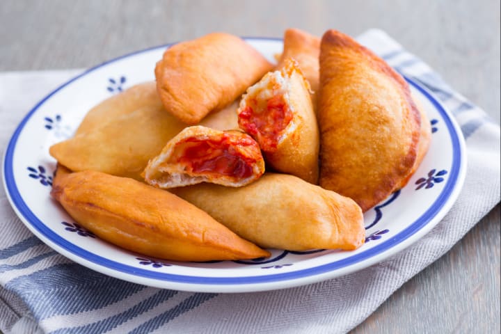 Panzerotti are crescent-shaped turnovers. A dough is prepared and the panzerotti are filled with tomatoes and mozzarella. They’re deep-fried. They can also include other ingredients like pepperoni.