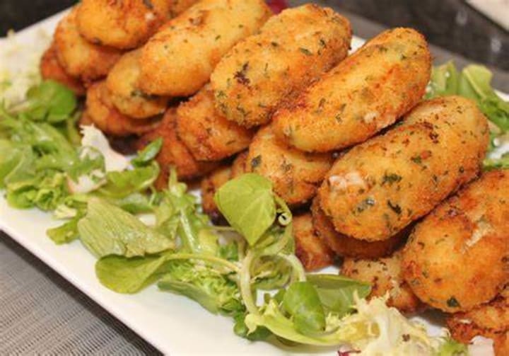 Croquetas are traditional Spanish fritters. They’re made with a buttery bechamel base which is well-chilled and formed into or round cylindrical patties. The patties include ham or shredded chicken and can include other ingredients like shrimp or mushrooms. Once the ingredients are incorporated they are coated in egg wash and breadcrumbs then fried crispy and golden.