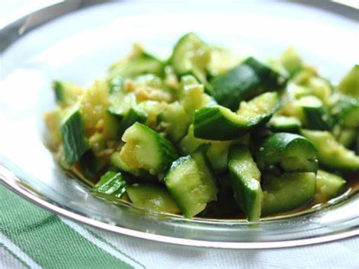 Smacked cucumber is a traditional Asian dish most popular in Tibet. Peeled cucumbers are sliced into chunks and then smacked with a rolling pin so they’re bruised and breaking apart. They’re combined with garlic, sesame oil, black vinegar, and soy sauce.