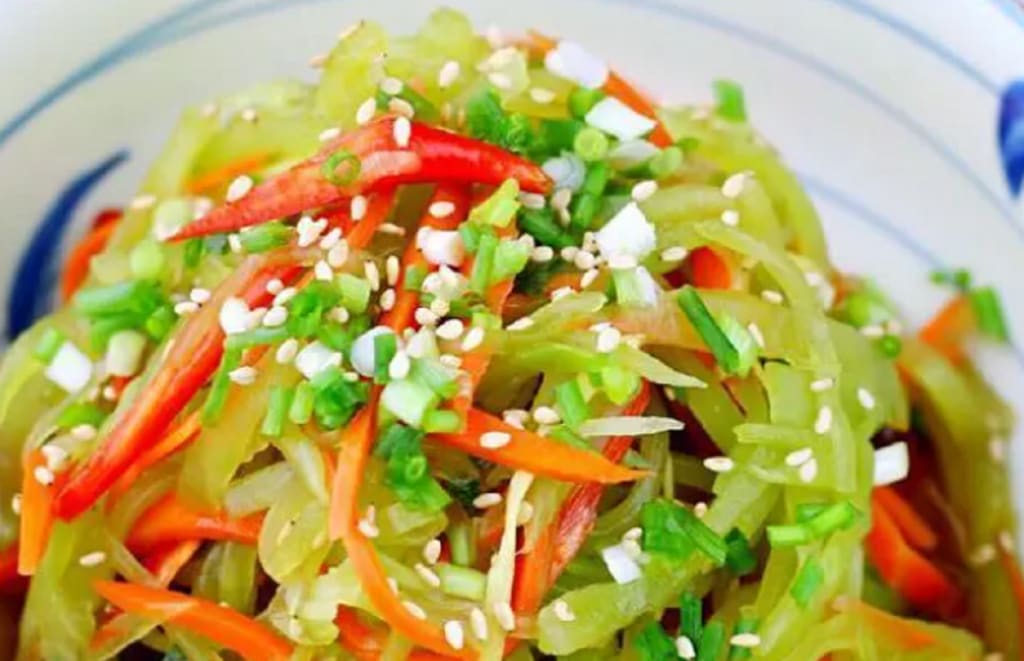 Cut half a head of lettuce into silk, mix with sugar, salt, vinegar, can also add sesame oil. The dish is fresh and crisp.