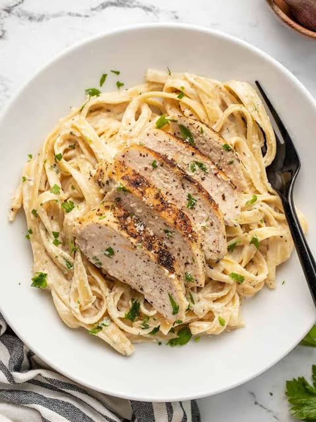 6. **Serve:** Divide the chicken Alfredo pasta among serving plates or bowls. Garnish with chopped fresh parsley for a pop of color and flavor. Serve hot and enjoy!